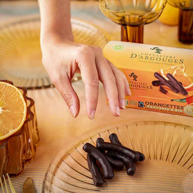 Imaginez le croquant du chocolat noir qui protège le moelleux d’une orangette confie biologique et issue du commerce équitable.