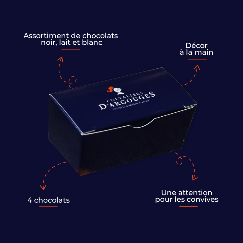 Fondez de plaisir pour notre assortiment de chocolats noir 70% de cacao, lait 33% de cacao et blanc le tout présenté dans un mini ballotin 40g. Le croquant de nos pralinés et le moelleux de nos ganaches sauront à coup sûr satisfaire vos papilles.