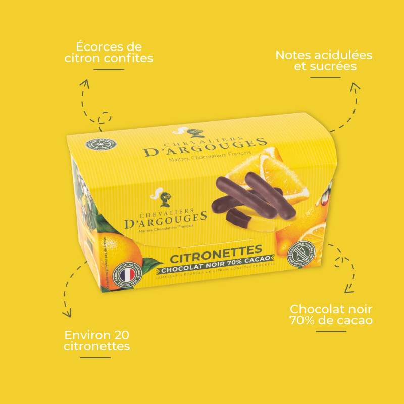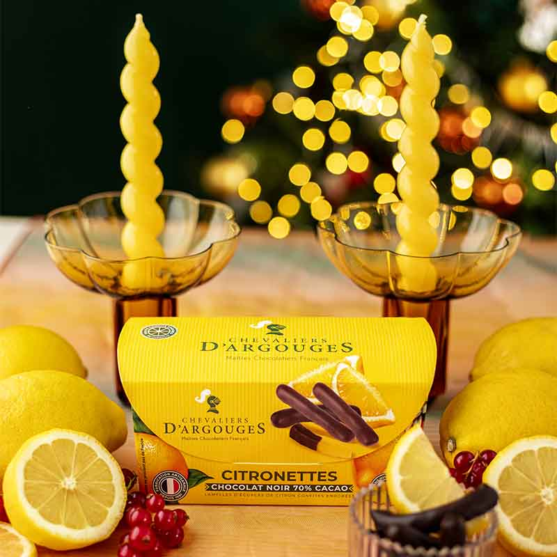 Offrez-vous un Noël acidulé avec nos citronettes confites enrobées de chocolat noir 70%.