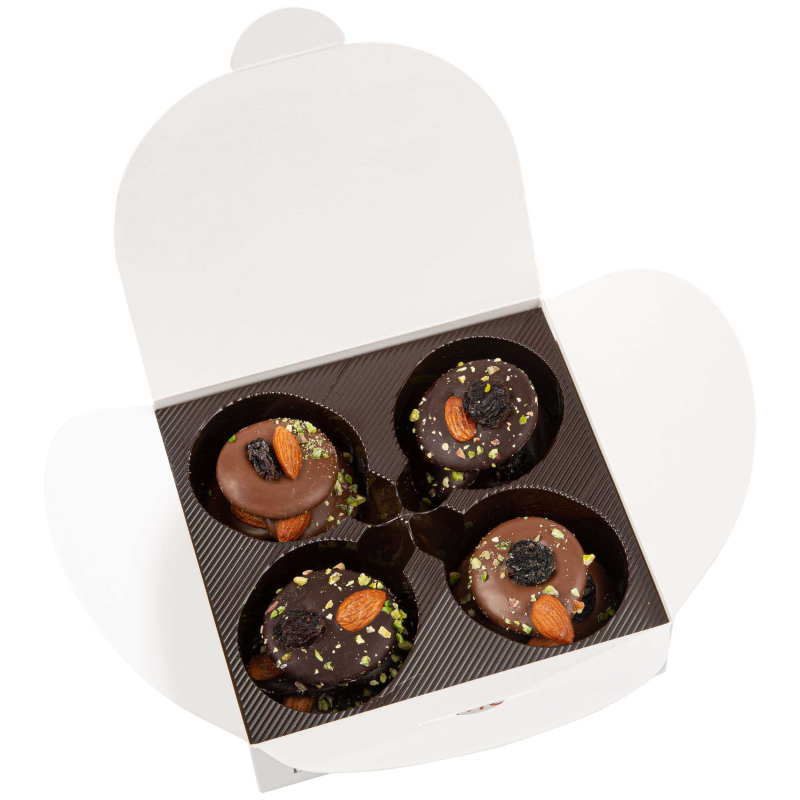 Une savoureuse alliance de chocolat noir 70% de cacao, de chocolat au lait 32% de cacao et de fruits secs croquants (amandes, raisin et pistache).