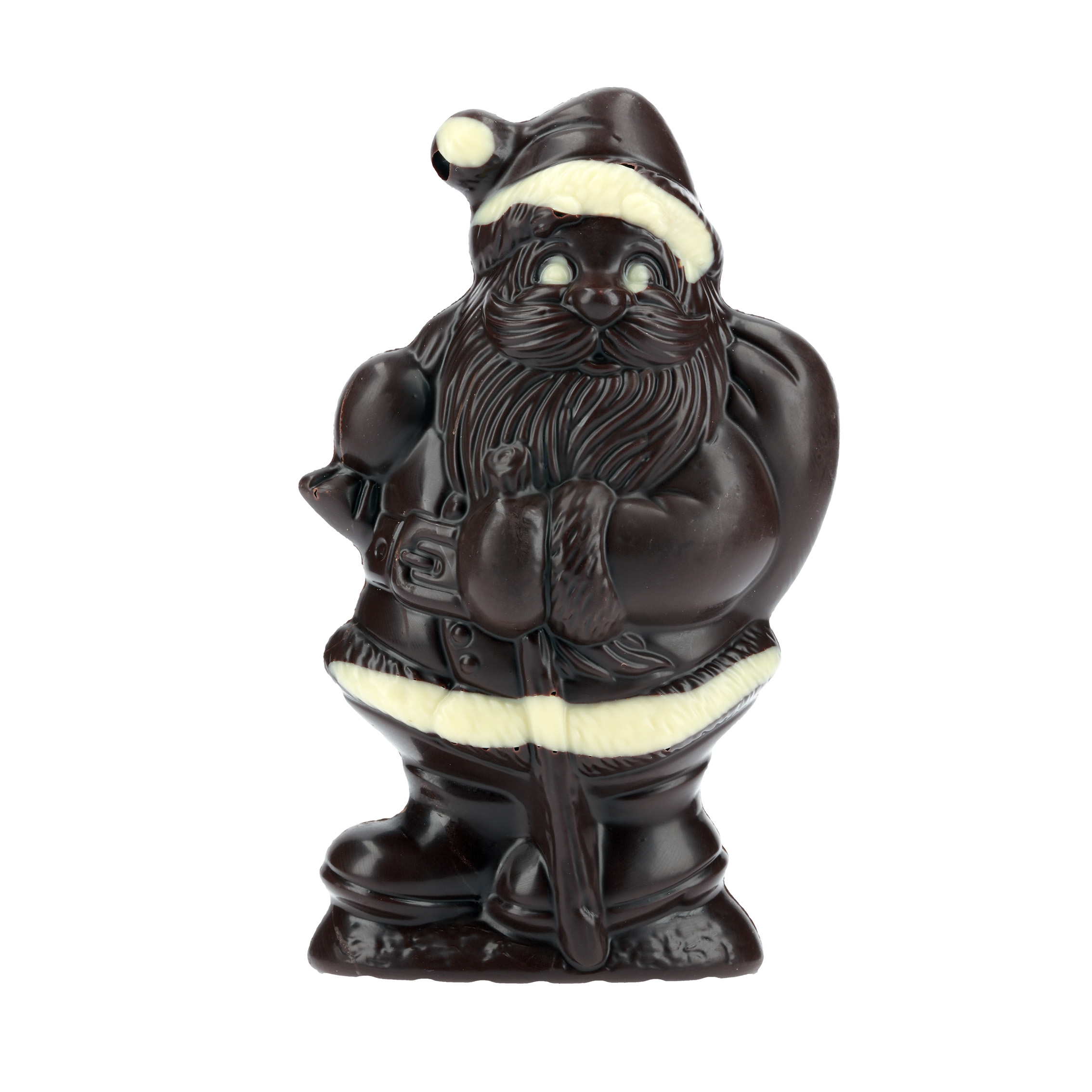 Ce moulage Père Noël en chocolat noir, 12,5 cm, décoré à la main, est parfait pour accompagner vos cadeaux au pied du sapin