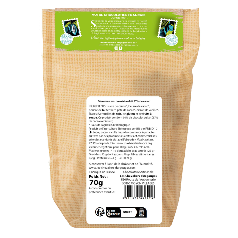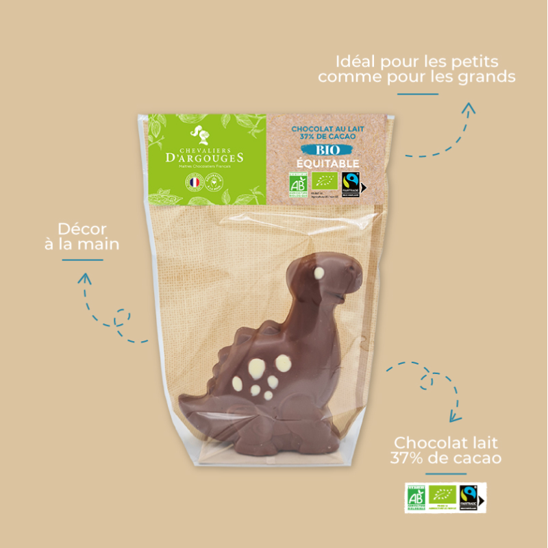 Plongez dans un univers fantastique avec ce dinosaure, moulé en chocolat lait bio 37% de cacao et décoré à la main dans nos ateliers en Normandie.