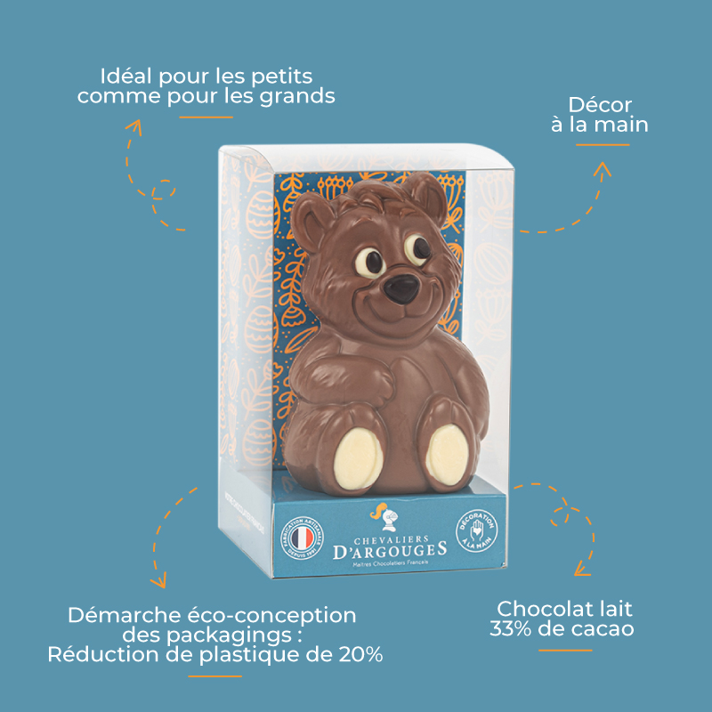 Craquez pour cet ours, moulé en chocolat lait 33% de cacao et décoré à la main dans nos ateliers en Normandie.