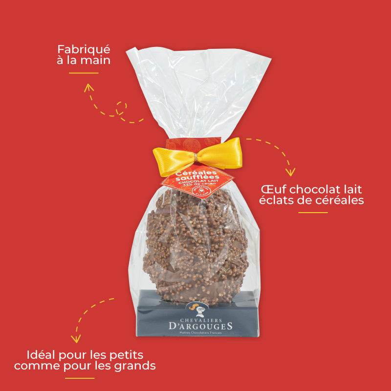 Succombez à cet œuf éclats de céréales au chocolat lait 33% de cacao et fabriqué à la main dans nos ateliers en Normandie.