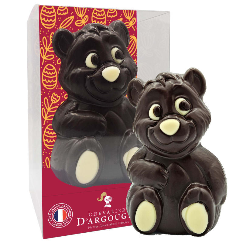 Craquez pour cet ours, moulé en chocolat noir 70% de cacao et décoré à la main dans nos ateliers en Normandie.