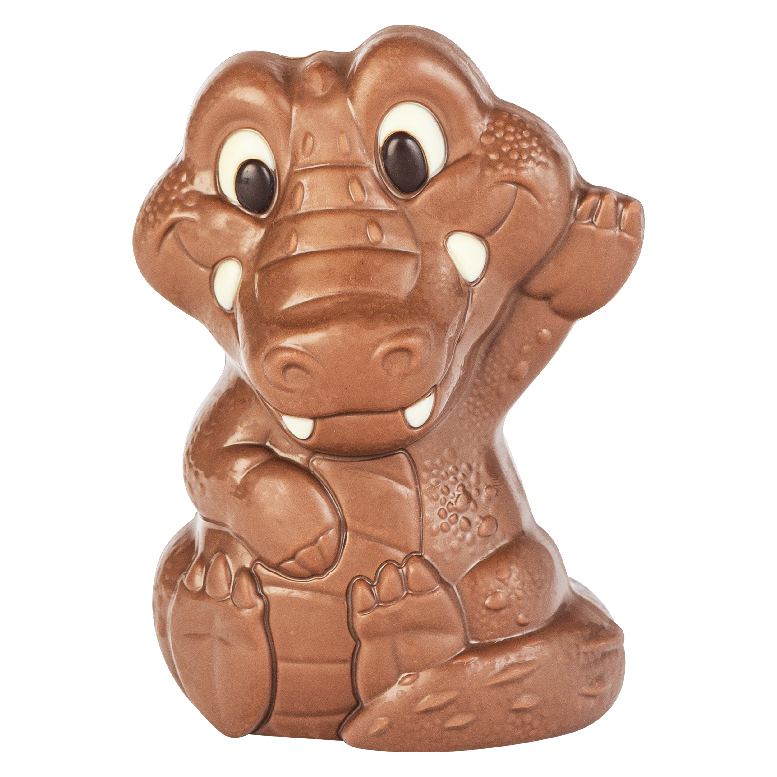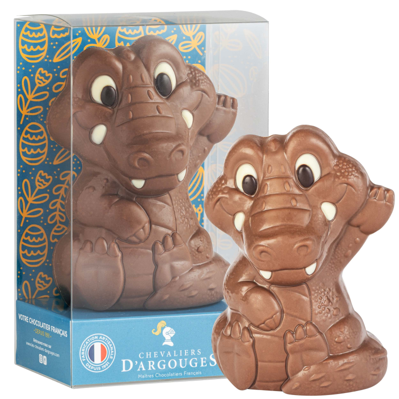 Craquez pour ce crocodile, moulé en chocolat au lait 33% de cacao et décoré à la main dans nos ateliers en Normandie.