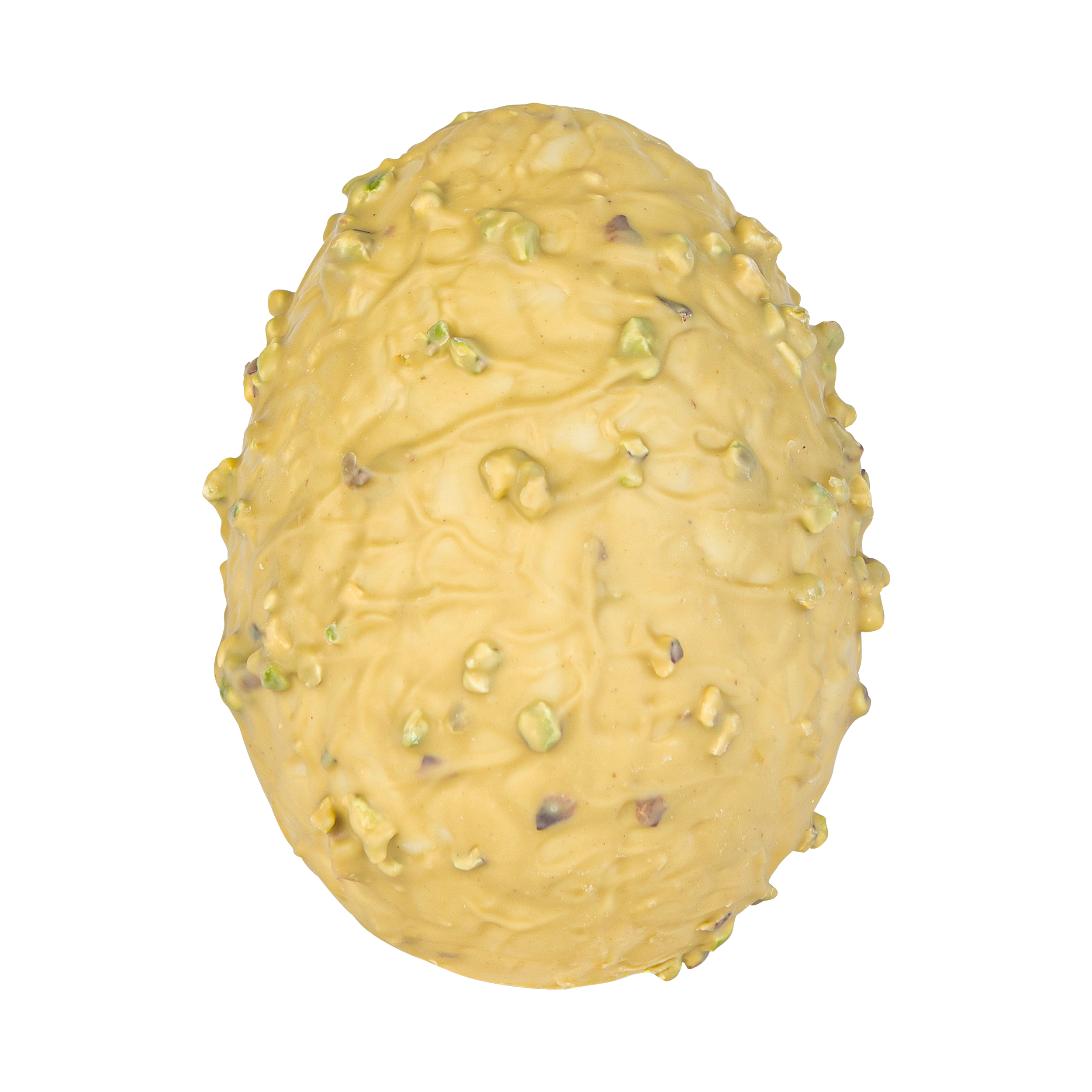 Succombez à cet œuf éclats et purée de pistache au chocolat blanc 28% de cacao et fabriqué à la main dans nos ateliers en Normandie.