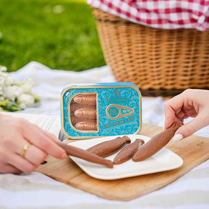 La pêche estivale : des belles sardine chocolat lait 33% de cacao et fabriqué à la main dans nos ateliers en Normandie.
