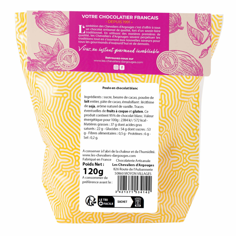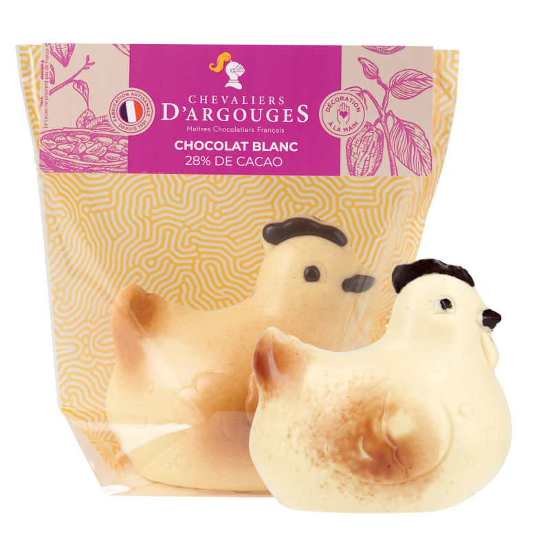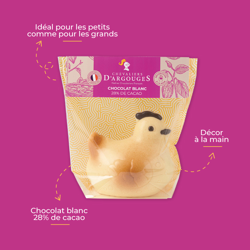 Craquez pour cette poule, moulé en chocolat blanc 28ù de cacao et décoré à la main dans nos ateliers en Normandie.