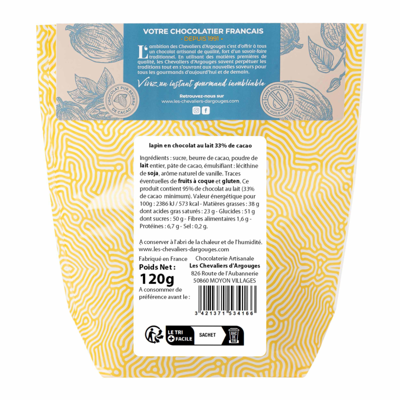 Craquez pour cet lapin, moulé en chocolat lait 33% de cacao et décoré à la main dans nos ateliers en Normandie.