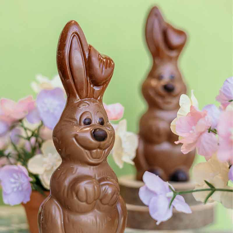 Craquez pour ce lapin, moulé en chocolat lait 33% de cacao et décoré à la main dans nos ateliers en Normandie.