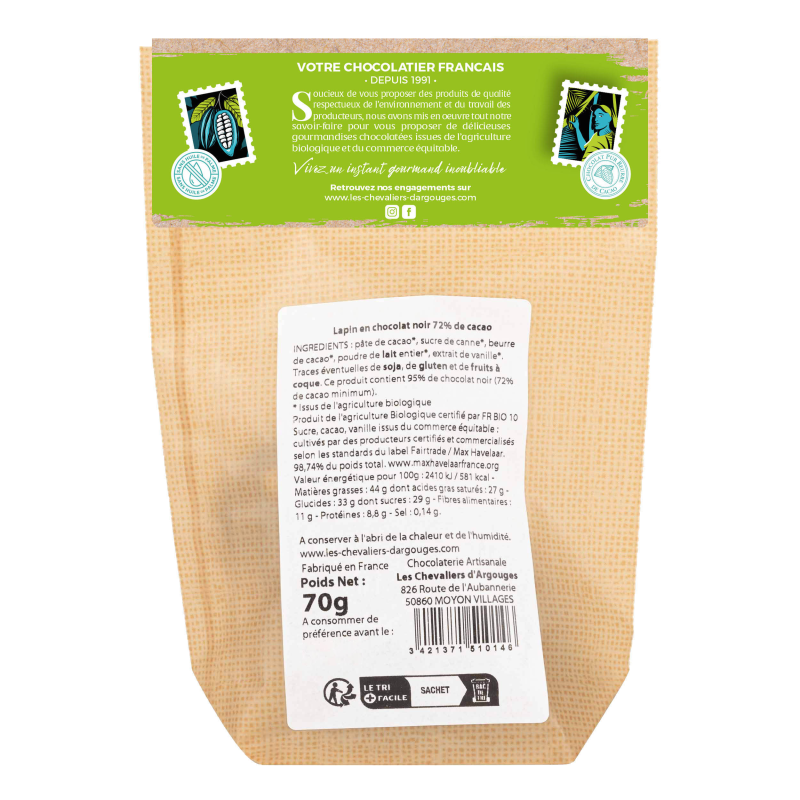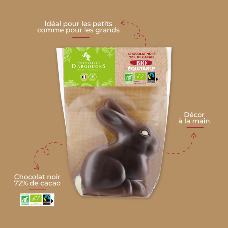 Craquez pour ce lapin, moulé en chocolat noir bio 72% de cacao et décoré à la main dans nos ateliers en Normandie.