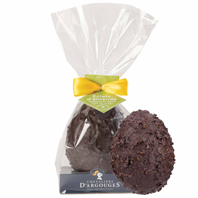Succombez à cet œuf éclats d'amandes au chocolat noir 70% de cacao et fabriqué à la main dans nos ateliers en Normandie.