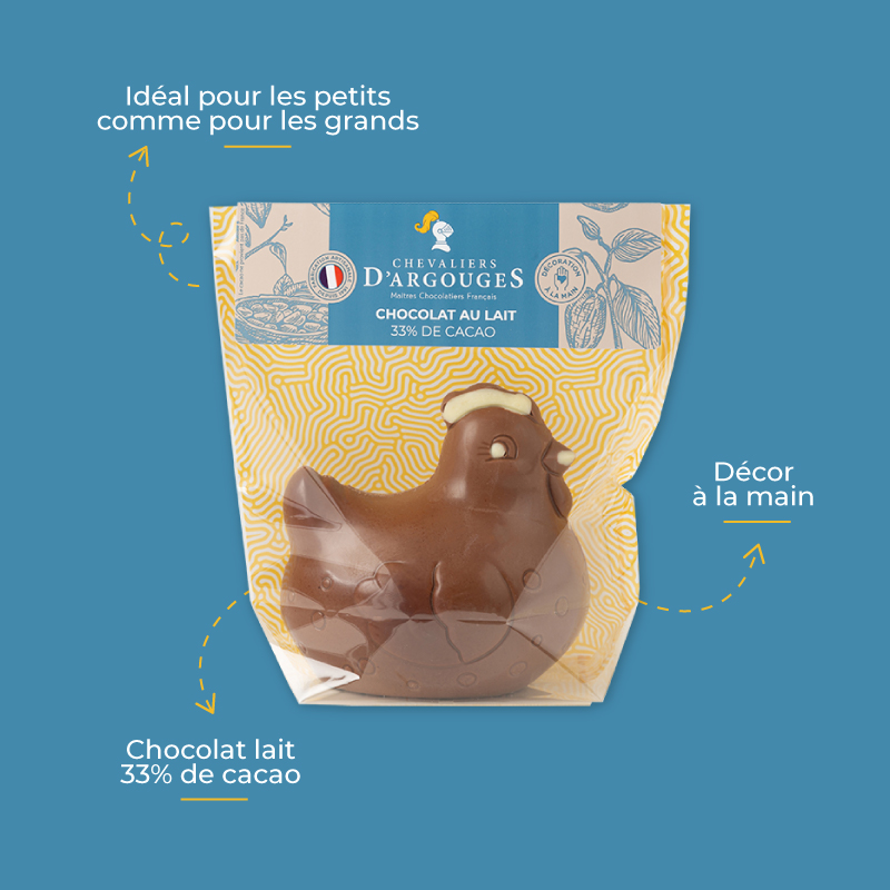 Craquez pour cette poule, moulé en chocolat lait 33% de cacao et décoré à la main dans nos ateliers en Normandie.