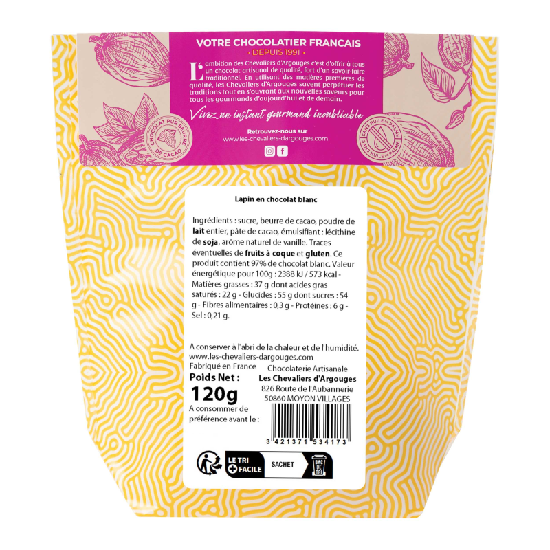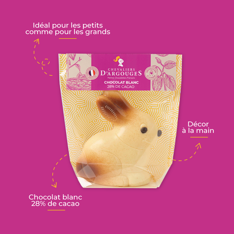 Craquez pour ce lapin, moulé en chocolat blanc 28% de cacao et décoré à la main dans nos ateliers en Normandie.