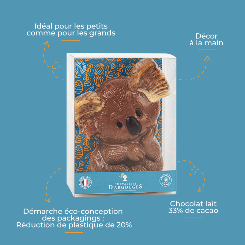 Craquez pour ce koala, moulé en chocolat lait 33% de cacao et décoré à la main dans nos ateliers en Normandie.
