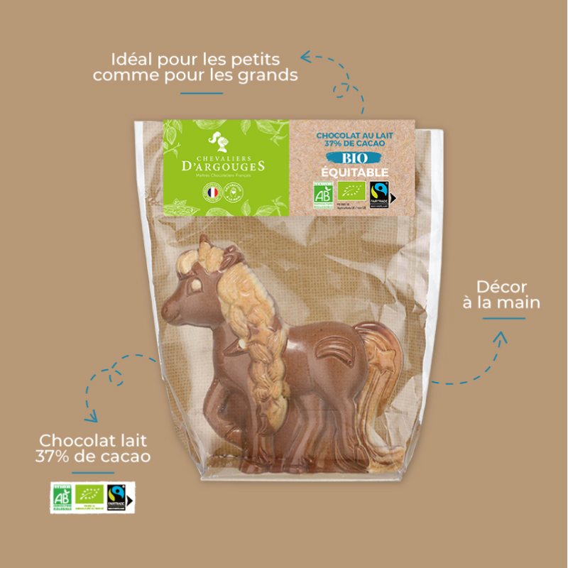 Plongez dans un univers fantastique avec cette licorne, moulé en chocolat lait bio 37% de cacao et décoré à la main dans nos ateliers en Normandie.