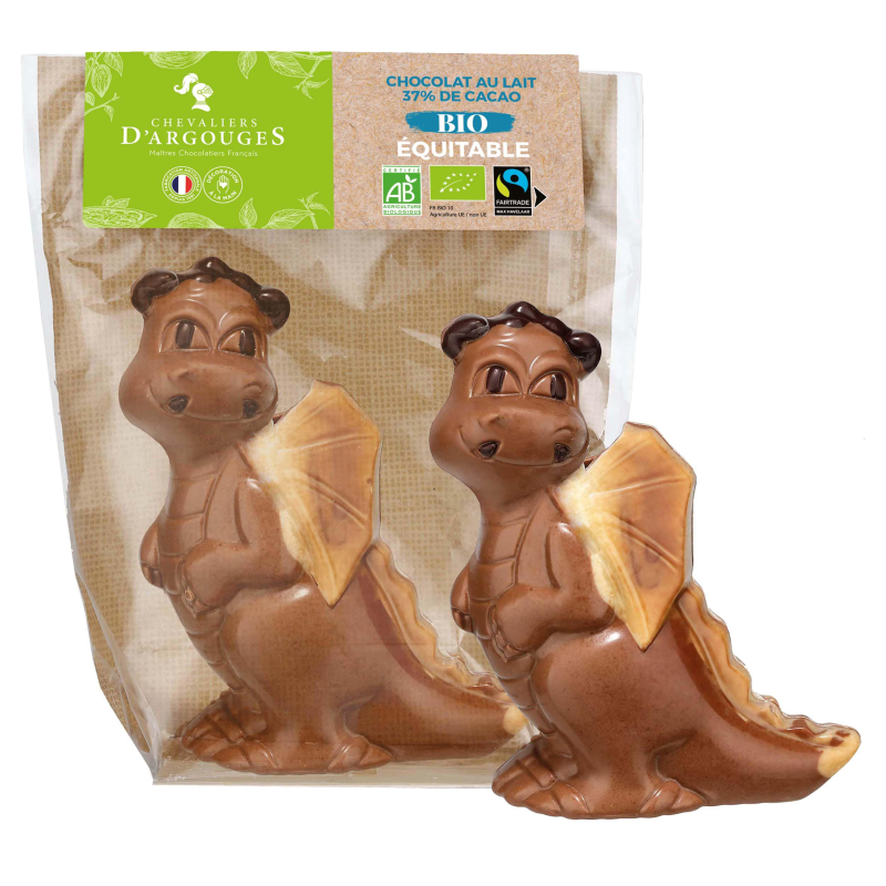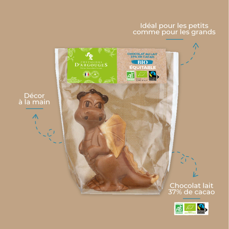 Plongez dans un univers fantastique avec ce dragon, moulé en chocolat lait bio 37% de cacao et décoré à la main dans nos ateliers en Normandie.