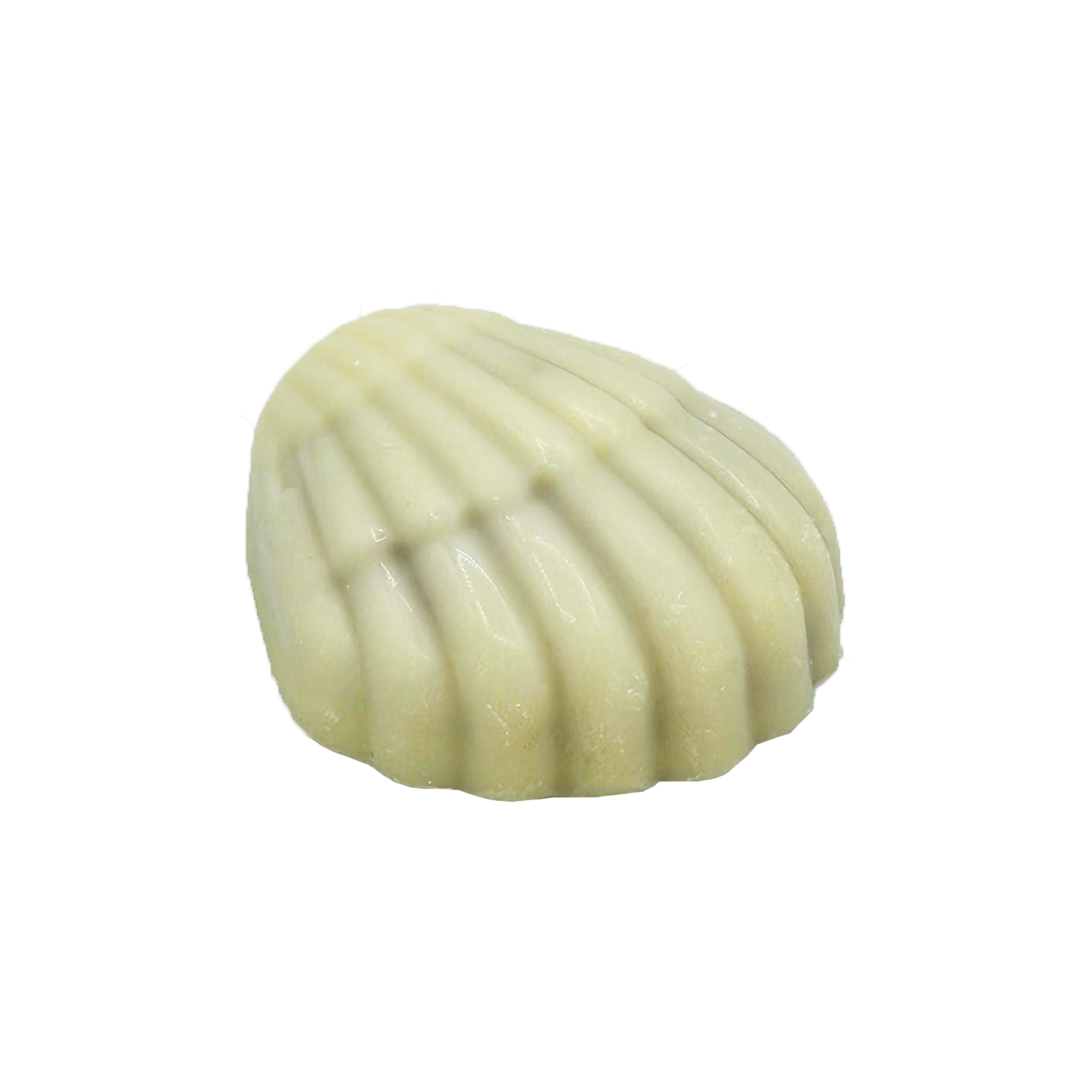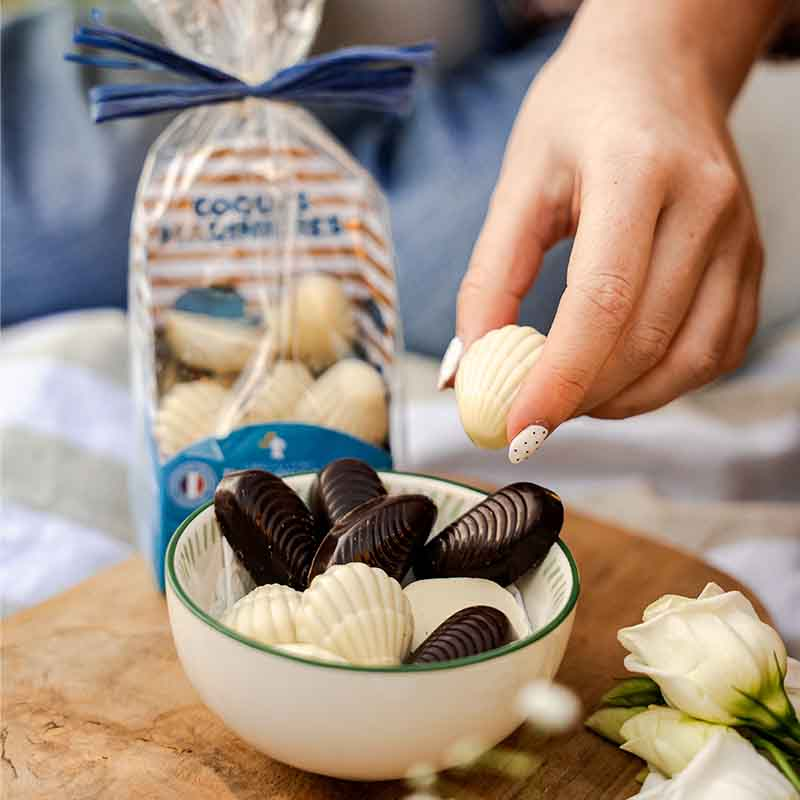 La pêche estivale : des belles coques chocolat blanc fourrées au praliné et fabriqué à la main dans nos ateliers en Normandie.