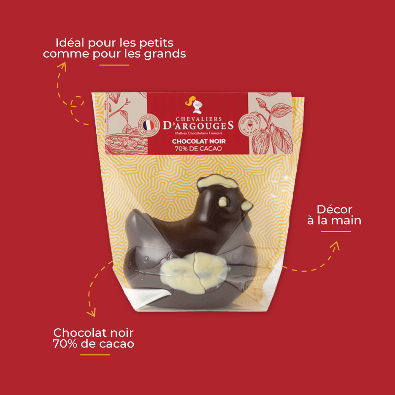 Craquez pour cette poule, moulé en chocolat noir 70% de cacao et décoré à la main dans nos ateliers en Normandie.
